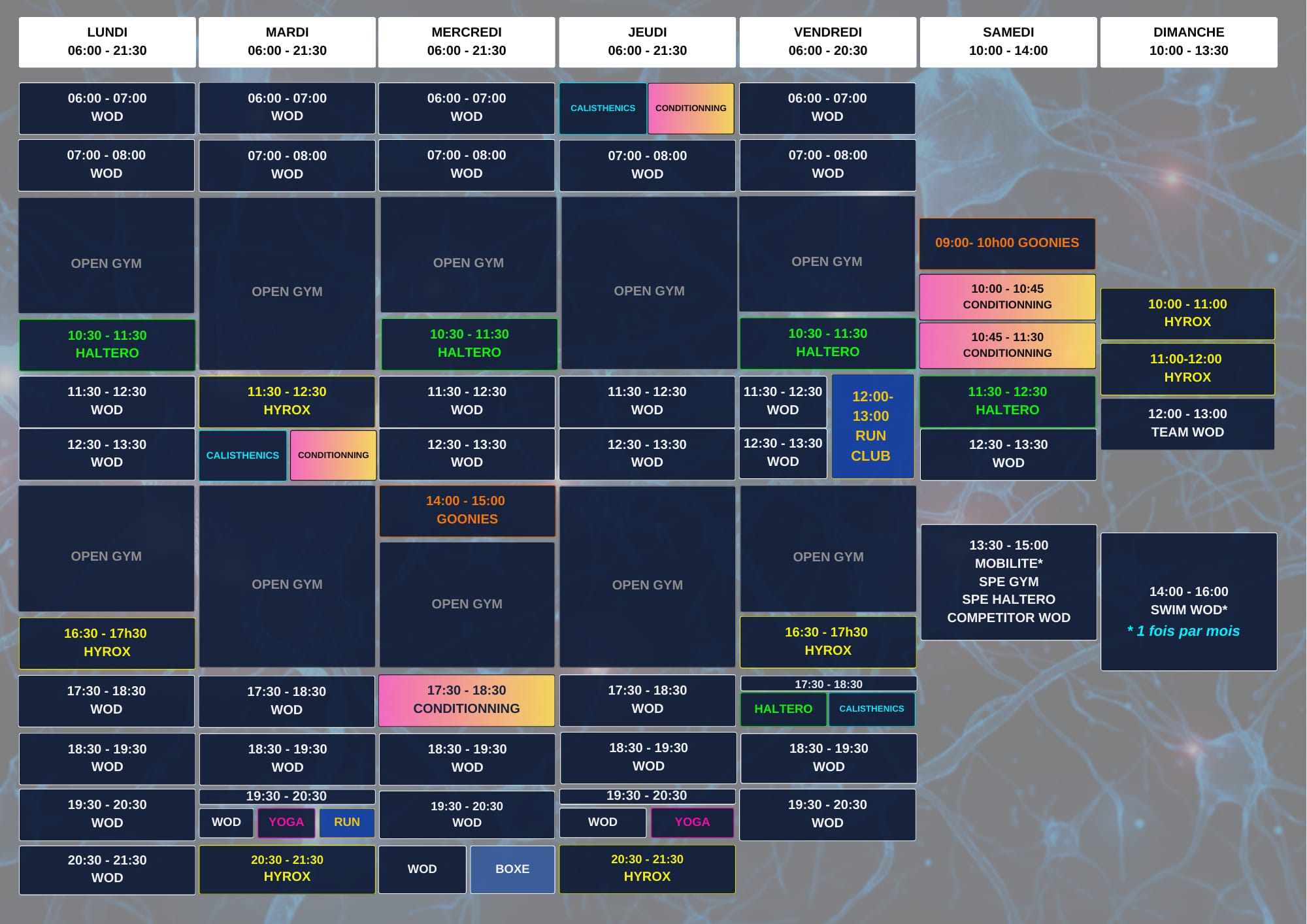 Le planning est très varié proposant un large panel d'activités (WOD, HYROX, GYM, YOGA, CONDITIONNING, HALTERO, …), il y a de quoi faire et ça on aime !